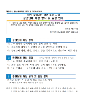 2026년 경기문화재단 공연예술 활성화 지원 공고□ 사업개요1. 사업 목적○ 도내 유망 공연예술가의 발굴‧육성 및 우수한 공연예술 창작물의 제작‧발표 지원- 동시대성과 다양성, 수월성을 지향하는 기초예술 분야(연극, 창작뮤지컬, 창작오페라, 무용, 음악, 전통예술 등) 공연 신작 및 개작의 제작‧발표 기회 확대로 도내 유망 공연예술인의 창작활동활성화 및 경기도 공연예술 저변 확대 도모2. 지원 방향○ 신‧개작 발표 지원 : 공연예술 분야 신작/개작 초연 발표(공연제작) 지원- 선정 작품의 실연심의를 위한 공동 쇼케이스 운영 지원- 전문가 컨설팅 및 워크숍 운영 지원으로 공연 제작을 위한 실질적 자문 제공- 우수 작품의 신작 및 개작 발표를 위한 공연장소 및 제작비 일부 지원3. 사업 기간○ 2026년 4월~12월4. 지원 규모○ 신‧개작 발표 지원- 무대화 및 공동 쇼케이스 지원 : 총 12건(1건 당 1천만원 정액지원)- 본공연(초연) 지원 : 우수작품* 최대 6건(건당 최대 5천만원 지원)*본공연(초연) 지원 대상은 쇼케이스 실연심의를 통해 결정※ 자세한 내용은 참부파일 참조